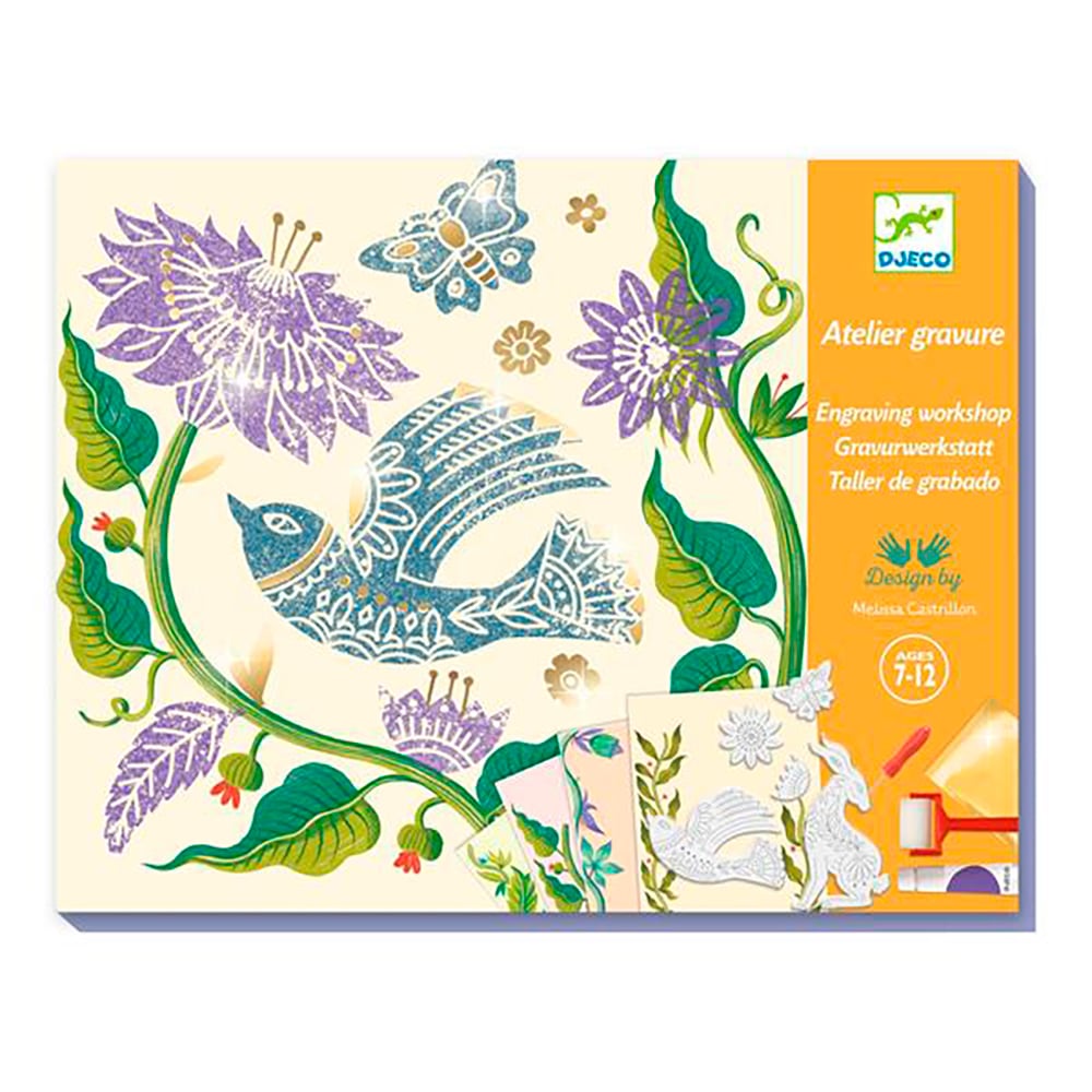 Une activité d'initiation à la gravure comprenant une planche d'éléments en polystyrène à orner de motifs en creux. L’enfant se munit de l'outil non contondant et crée des lignes et points en relief. Puis il utilise ses créations comme des tampons à l'aide de la peinture fournie pour réaliser 12 cartes à sa guise. Il vient parfaire ses créations de touches métallisées grâce aux patchs collants sur lequel il transfère la matière brillante.