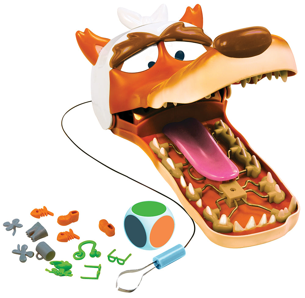 Ce loup a mangé vraiment n'importe quoi, et des objets sont coincés dans sa gueule. A l'aide de la pince, retire délicatement l'objet de la couleur indiquée par la flèche du spinner! Mais attention à ne pas te faire mordre, et si tu touches son appareil en métal, il risque de relâcher sa terrible mâchoire!