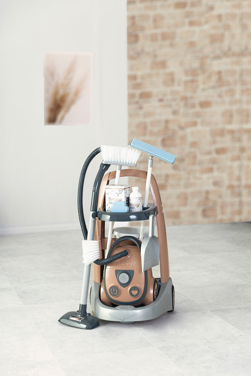 Le chariot est équipé de plusieurs accessoires réalistes, dont un balai, une brosse, une pelle, une vadrouille et un seau. Pour encore plus de réalisme, l’ensemble inclut aussi un aspirateur avec véritable son d’aspirateur, ce qui rend le jeu encore plus amusant et immersif.