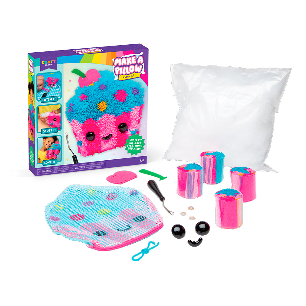 You can have fun making an adorable 25 x 30 cm (10 x 12 inch) muffin pillow. This kids' craft kit is a fantastic way to encourage children's creativity and imagination while helping them develop their love of crafts. The fluffy and soft muffin pillow will make a cute pillow for your child's room or a cozy pillow to snuggle up with. Everything you need is included: the handy crochet tool, pre-cut yarn, and easy-to-follow color-coded canvas let you start your project in a flash. The sturdy canvas features fabric-lined edges and hanging loops to create your own soft and fluffy design, ready to display or use. It's a great anytime project! Get ready to loop, hang, and pull to create a masterpiece that's as fun to make as it is to display or cuddle! Introducing the Make a Pillow Muffin Kit—the perfect blend of creativity, fun, and simplicity for crafters ages 6 and up. This delightfully cute craft kit is designed for beginners, making it an ideal choice for young crafters just starting out or seasoned crafters looking for a relaxing project. This yarn craft is easy to learn and complete for beginners and even experienced crafters thanks to the easy-to-follow printed template.