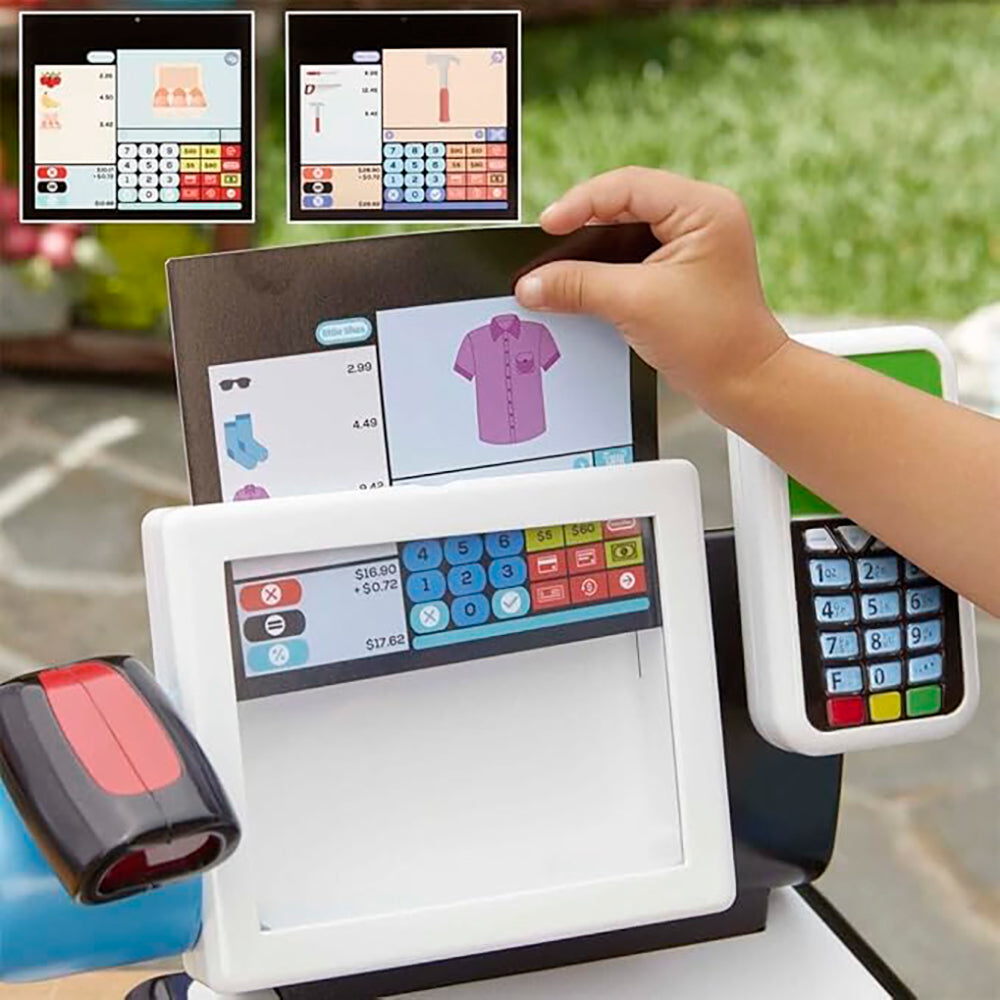 Cette caisse de jeu de rôle comporte un look moderne et compact et elle regorge de caractéristiques interactives : un numériseur fixe, un numériseur manuel, un clavier de paiement et un distributeur de pièces de monnaie. De plus, elle émet des bips sonores réalistes et s'illumine pour divertir pendant des heures de jeu imaginatif. Les enfants peuvent faire semblant de faire leurs courses dans une épicerie, une quincaillerie ou une boutique de vêtements, en choisissant entre les trois écrans inclus. Faire semblant d'aller au magasin aide les enfants à acquérir le sens des responsabilités qui est un élément important de l'apprentissage socio-émotionnel.