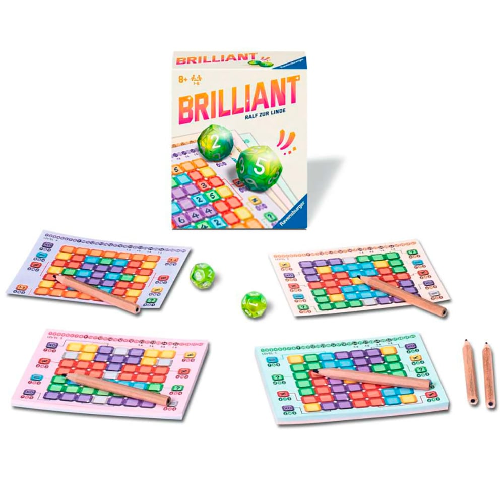 The goal of BRILLIANT is to fill the squares on your sheet with numbers as quickly as possible! Roll the dice and write one of the rolled numbers next to a number already filled. The game sheet is made up of colored squares; each color has its own rules for placing the numbers. Be quick, cunning, and strategic to be the first to fill your sheet!
