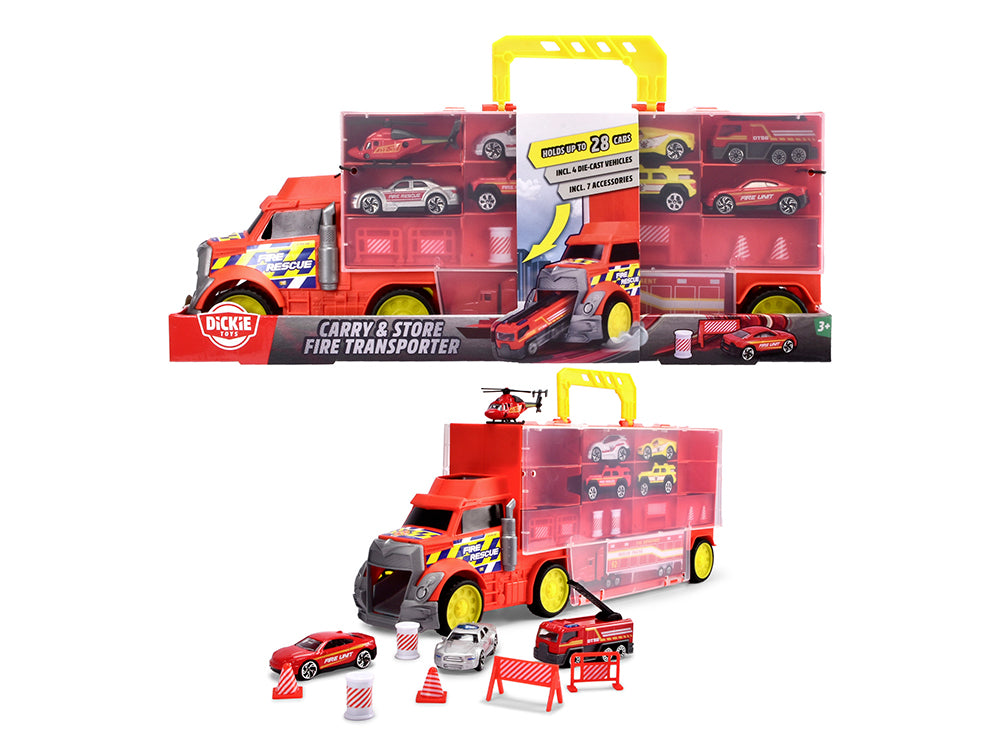 This multicoloured transporter is 43 cm long and features free-rolling wheels. It can hold up to 28 vehicles and has a handle for easy transport. The cab ramp adds to the fun. The set includes 4 die-cast fire trucks and accessories.