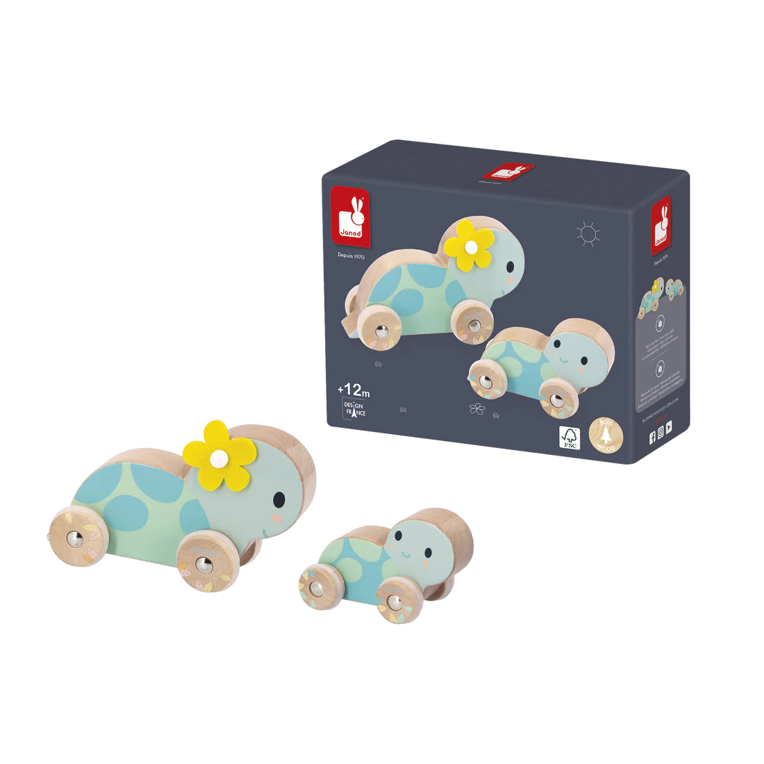 Prêtes pour l’aventure ! Les Grande et Petite Tortue sont de sortie et n’attendent qu’un petit explorateur pour partir en balade. Ce duo de tortues à promener, spécialement conçu pour les enfants dès 12 mois, est à la fois adorable, silencieux et parfaitement adapté aux petites mains.
